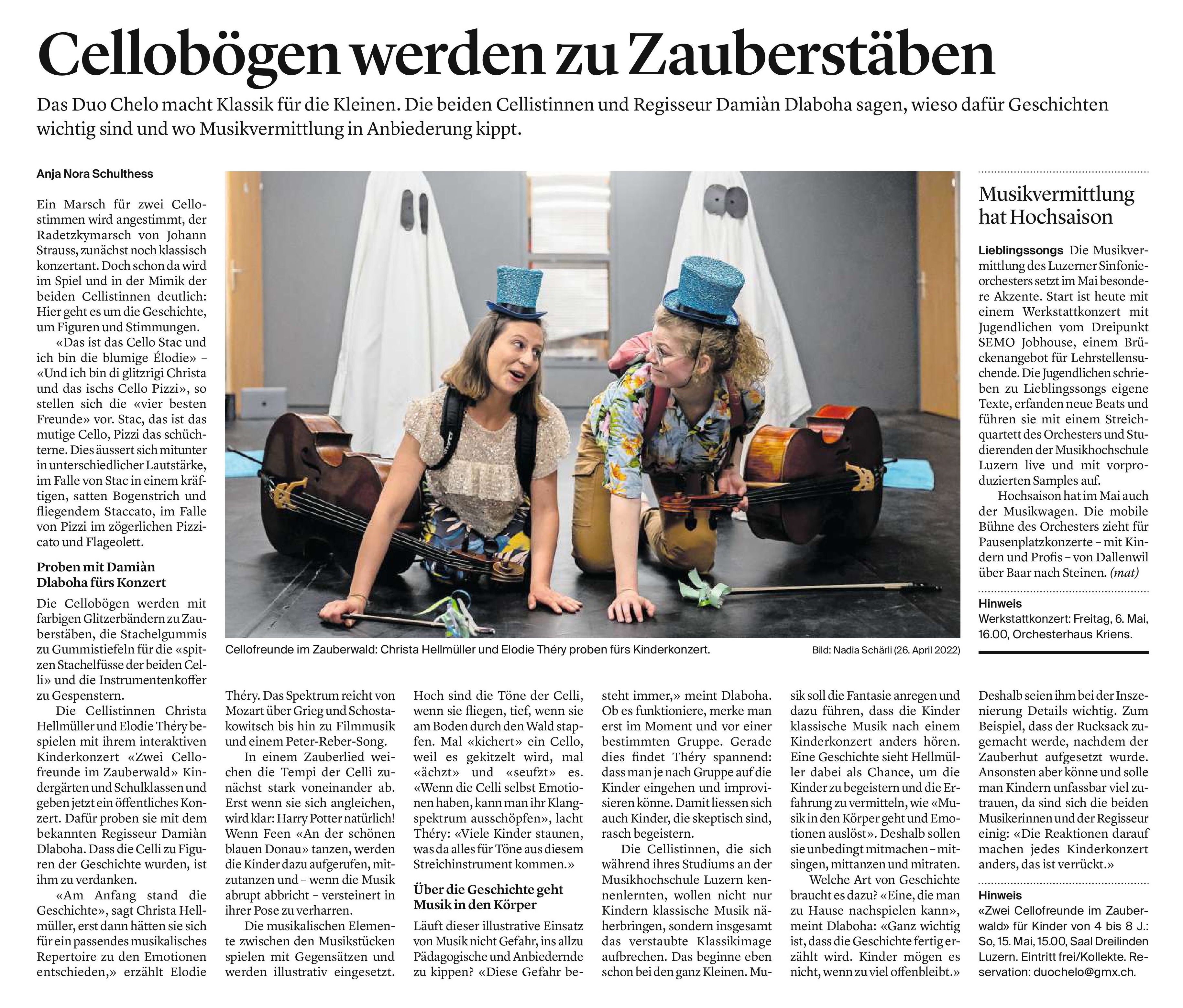 Das Duo CHELO spielt regelmässig klassische Konzerte in der ganzen Deutschschweiz. Zudem engagiert sich das Duo in der Musikvermittlung. Mit eigenen Produktionen treten die beiden Cellistinnen in Kindergärten und Primarschulen auf, um selbst den Kleinsten die Musik spielerisch näher zu bringen. Die kleinen Konzertbesucher sind dabei ein wichtiger Bestandteil, da sie aktiv in das Konzert miteinbezogen werden und mitsingen, mitlachen und mitraten können. Sie tauchen in eine fantasievolle Welt der Musik ein und lernen dabei unbewusst viele Sachen über die klassische Musik und das Cello. Das Duo kann von jedem Kindergarten/Schule für das Kinderkonzert gebucht werden (im Kanton Luzern via „schukulu.ch, Musik spezial“).